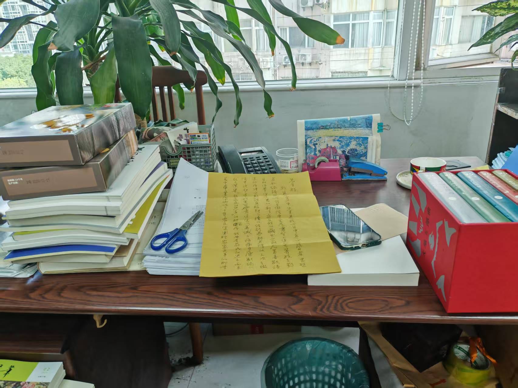 书中的林贤治是一个斗士,严肃沉重,风骨铮铮。第一次微信聊天时,林贤治就坦陈,自己是一个不合时宜的人,语带落寞。但见到林贤治后,发现本人很阳光,言笑晏晏,脚步轻快,看起来比实际年龄年轻不少。他的办公桌上堆叠着书籍和稿纸,却没有电脑,他仍然习惯于“爬格子”,用钢笔和稿纸一行行地书写那些大部头。